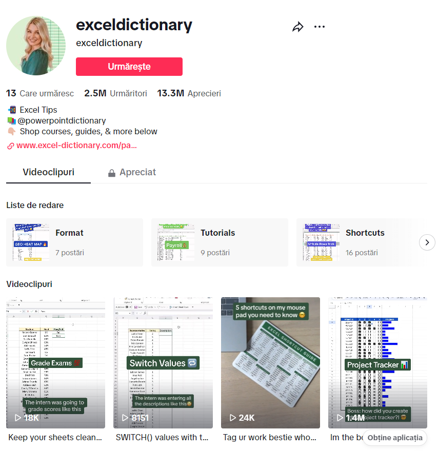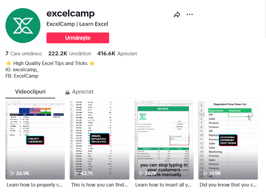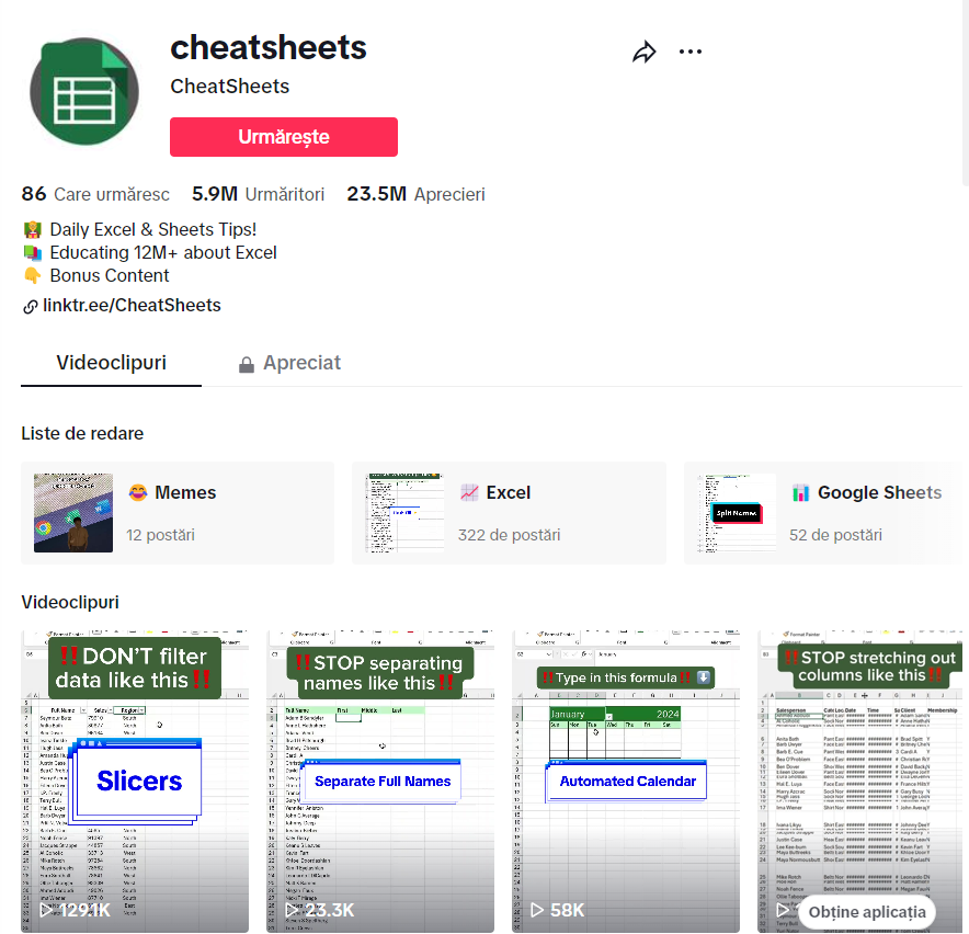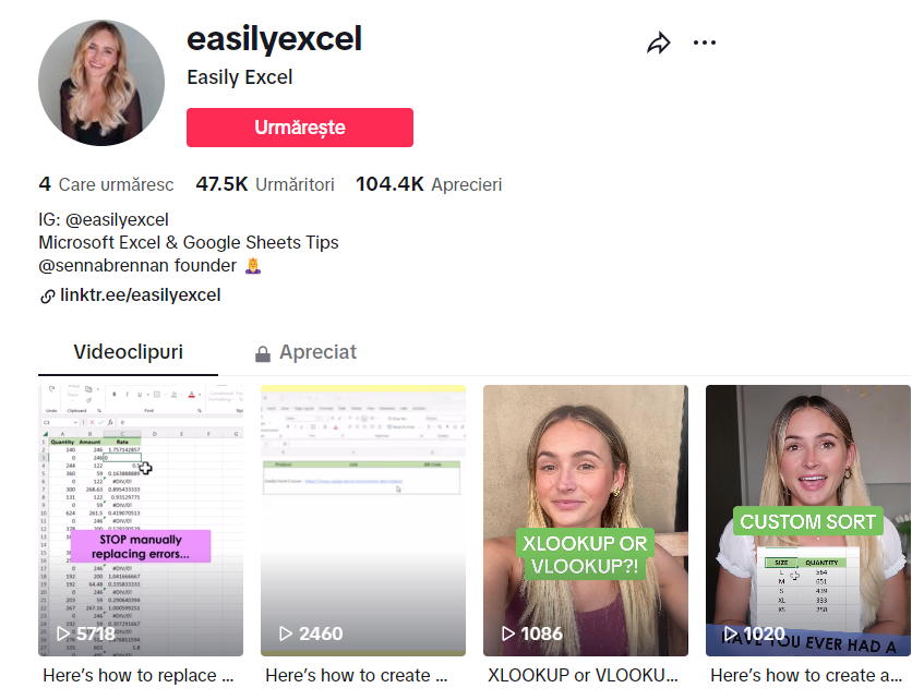 Pe acest cont vei găsi o mulțime de informații despre cum să folosești Excel, toate structurate în video-uri de câteva secunde.