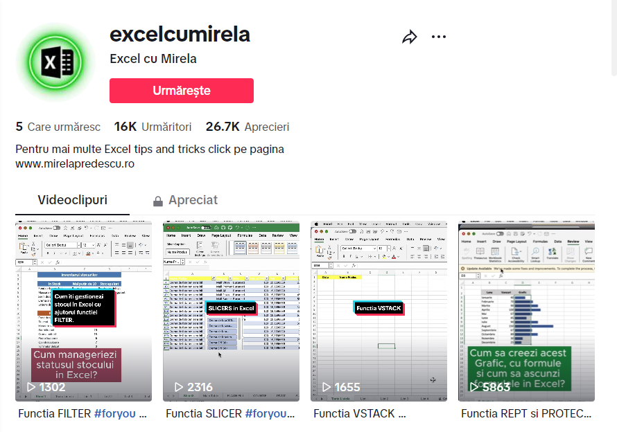 Contentul acestui canal este de tipul "how to", în care vei învăța în câteva secunde funcții importante pe care trebuie să le folosești în Excel.