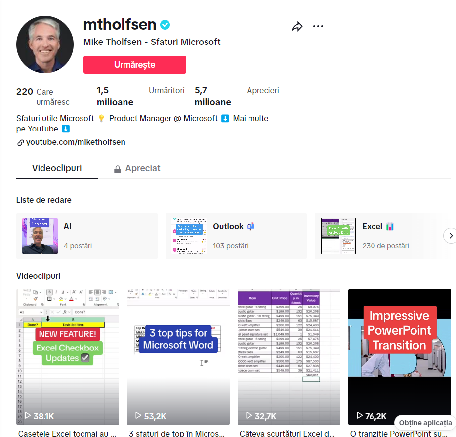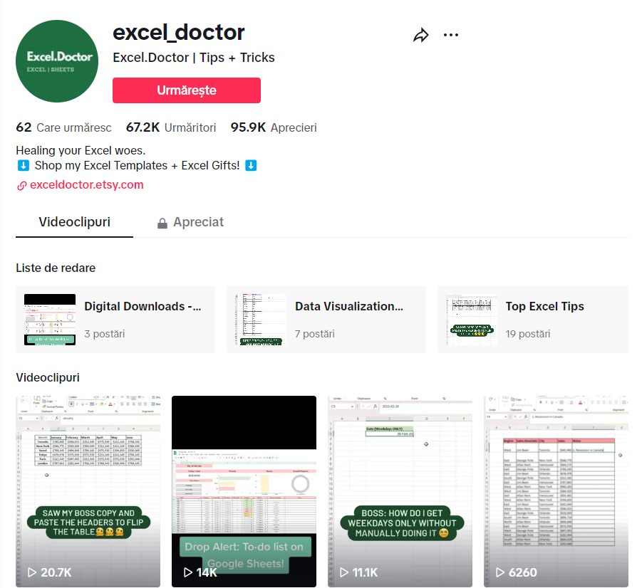Este unul dintre cele mai mari conturi de pe TikTok care oeră content de Excel, care a strâns aproape 6 milioane de urmăritori.