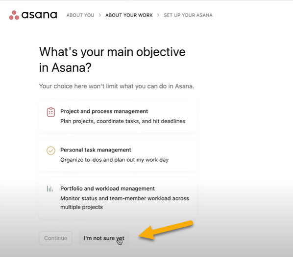 Vei observa că aplicația te va întreba care sunt obiectivele pe care ți le-ai propus în Asana, iar în cazul în care nu știi poți opta pentru varianta în care încă nu ești sigur, pe care o găsești în partea de jos.