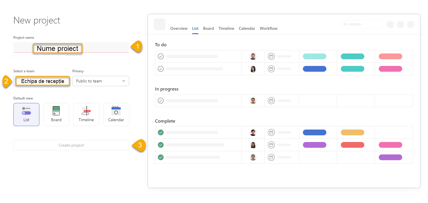 Următorul pas este să îți creezi proiectele – începe prin a crea câteva proiecte inițiale în genul “task-uri zilnice” sau ”ziua porților deschise”. După aceea adaugă sarcinile și atribui-le membrilor din echipă. Nu uita faptul că fiecare sarcină are câte un termen limită și detalii specifice. Aici poți include informații relevante care să îl ajute pe recepționer.