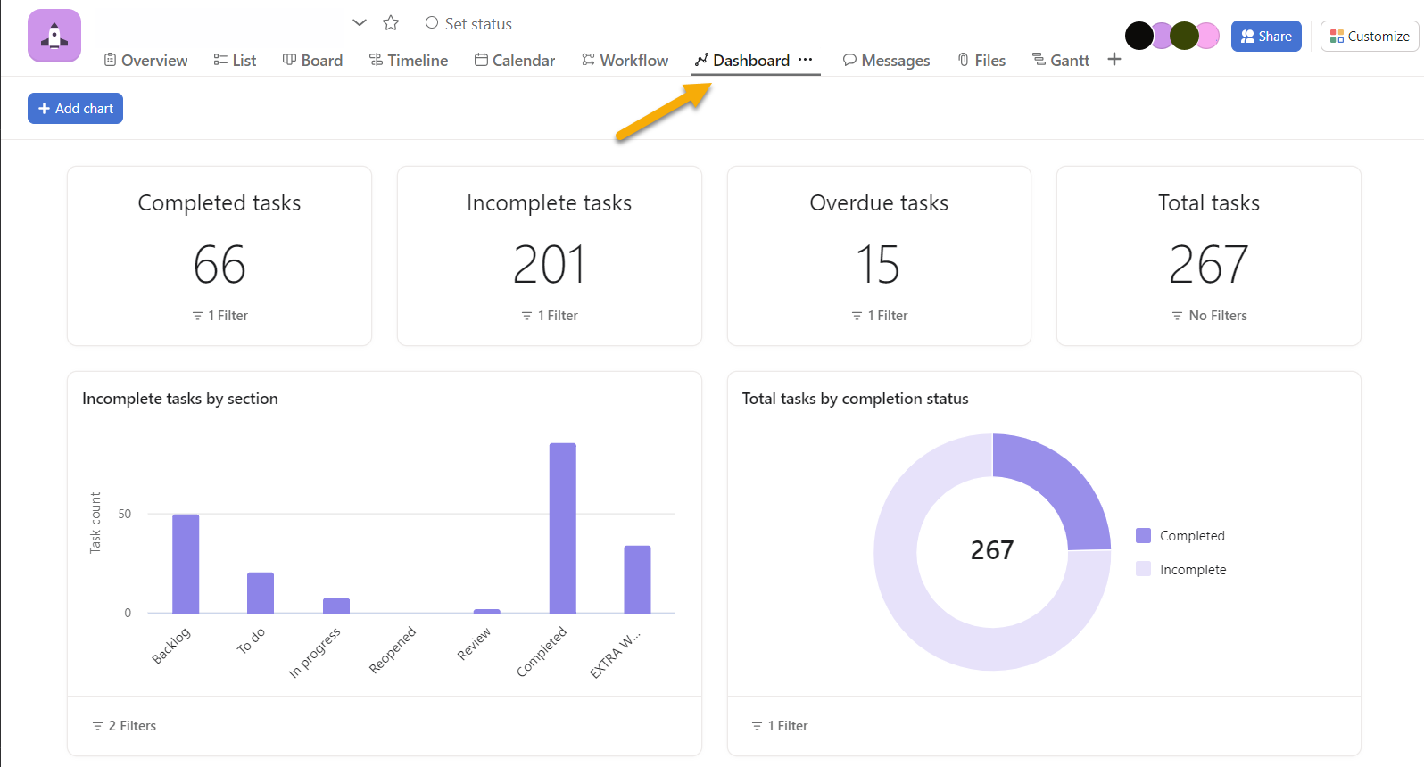 Asana mai are o funcționalitate extrem de benefică pentru echipa ta privind raportarea și partajarea rezultatelor. Practic, Asana îți permite să împărtășești progresul unui proiect și actualizările sale împreună cu ceilalți membri. În acest fel, te asiguri că toată lumea este informată despre statusul proiectului.