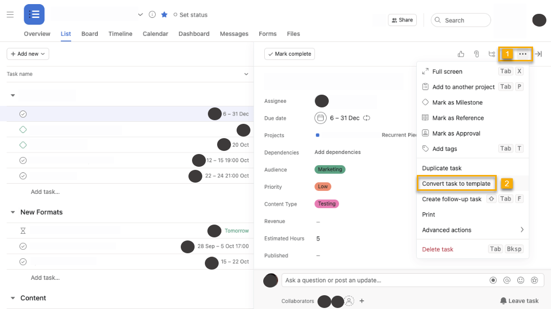 Prin utilizarea șabloanelor de sarcini poți configura rapid aceleași sarcini în mod repetat, fără a începe de la zero. Poți converti task-urile existente în șabloane sau poți crea altele noi pentru a economisi timp. Iată cum poți converti o sarcină într-un șablon: